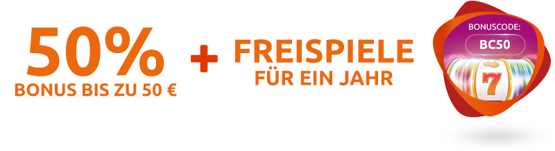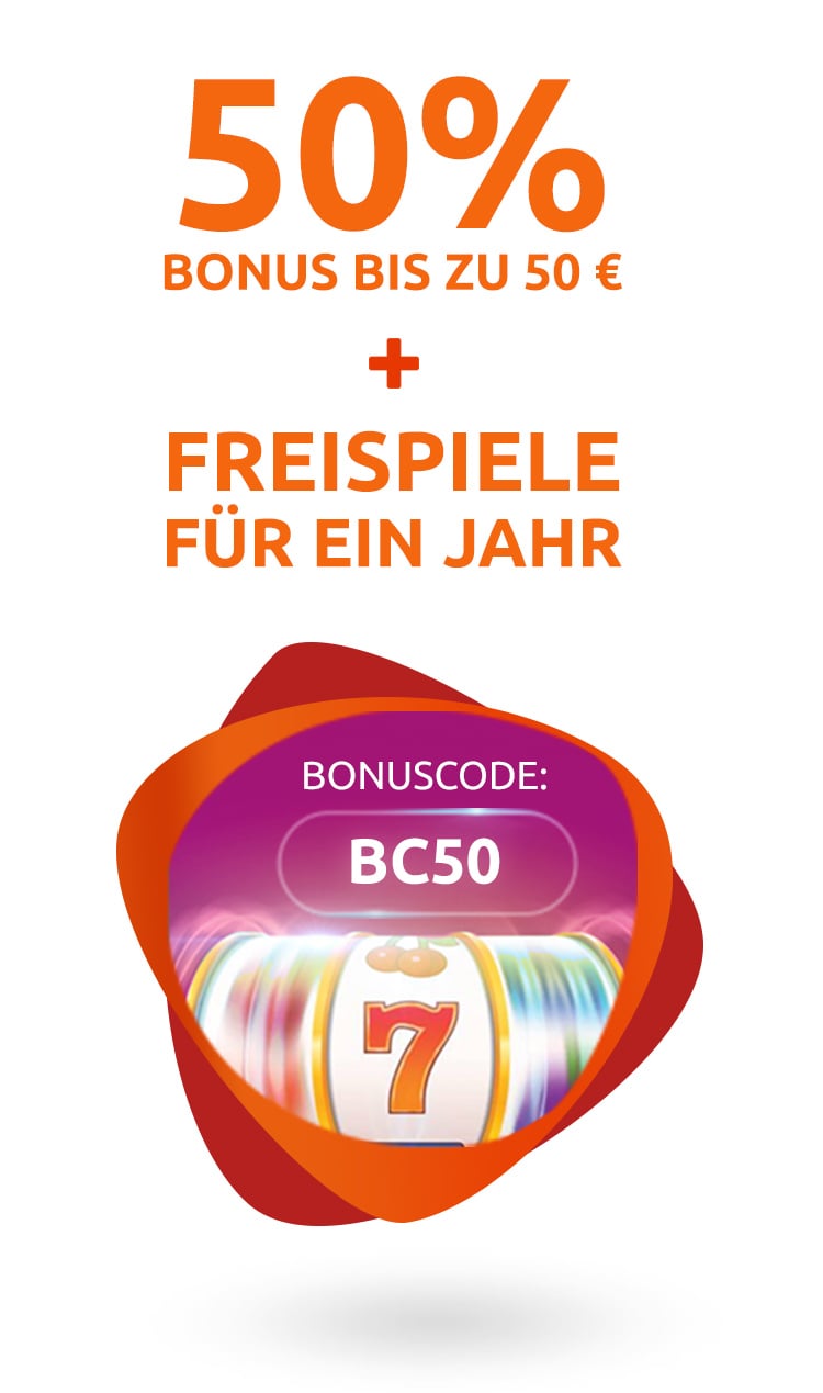 Dieses Angebot gilt nur für die erste Einzahlung. Um die Jahres-Freispiele zu erhalten, ist eine Einzahlung sowie die Eingabe des Werbecodes BC50 erforderlich. Die Mindesteinzahlung beträgt 50€. Der maximale Bonusbetrag liegt bei 50€. Die Gutschrift der Freispiele erfolgt wöchentlich immer donnerstags ODER freitags. Dabei werden dir pro Woche, im Zeitraum von 52 Wochen, 10 Freispiele gutgeschrieben. Einsatzanforderung: Innerhalb von 30 Tagen 30x den Einzahlungs- und Bonusbetrag setzen (nur Spielautomaten zählen). Der maximale Einsatz sind 10 % (min. 0,10€) des Bonusbetrags oder 5€ (geringster Betrag gilt). Einsatzanforderung: Innerhalb von 30 Tagen 60 Mal den Freispiel-Gewinnbetrag setzen (nur Spielautomaten zählen). Der maximale Einsatz sind 10 % (min. 0,10 €) des Freispiel-Gewinnbetrags oder 5 € (geringster Betrag gilt). Freispiele müssen vor dem eingezahlten Guthaben verwendet werden Es gelten die Bonusbedingungen..